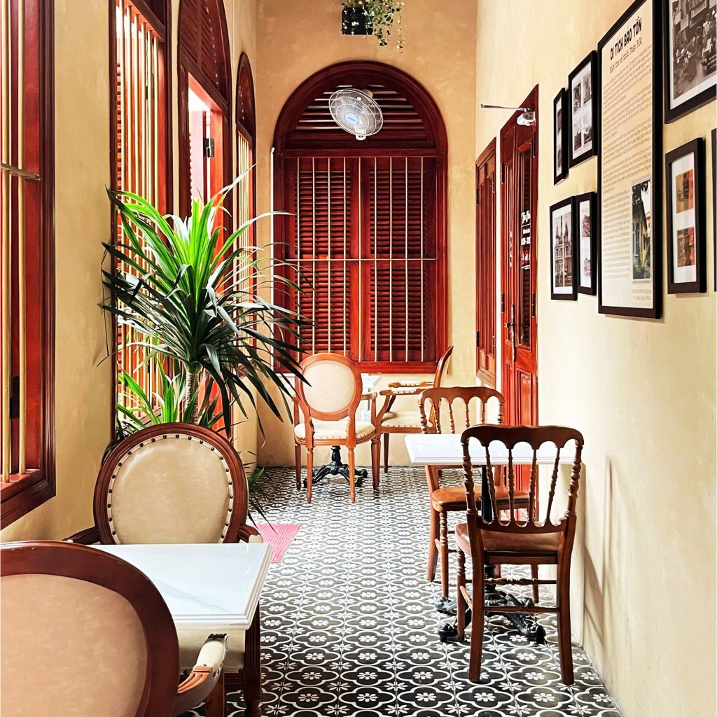 Hành lang dài với sàn gạch hoa vintage, bàn ghế gỗ và ánh sáng hắt qua khung cửa tạo nên background cực “ăn ảnh”. Đây cũng là nơi mà nhiều bạn trẻ chọn để check-in mỗi khi ghé quán.