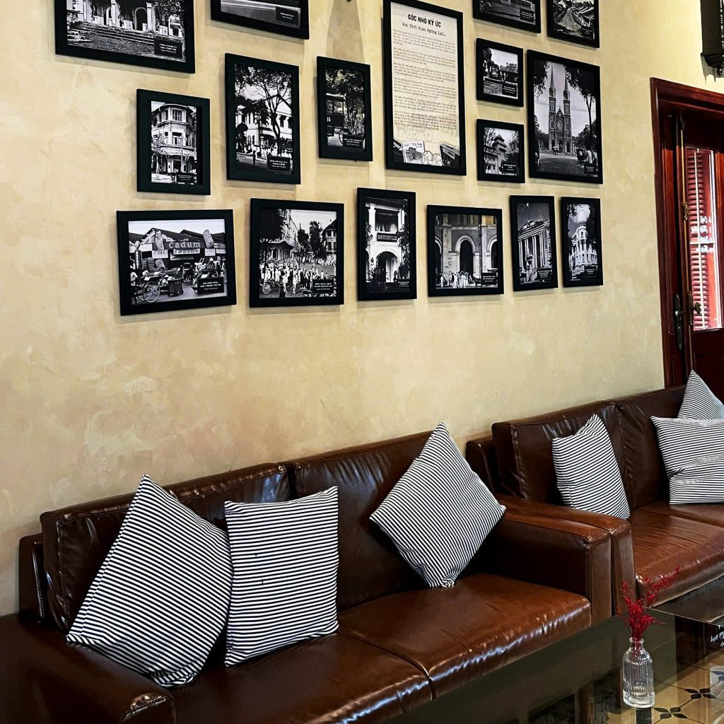 Bên trong quán, không gian được thiết kế tinh tế với ghế sofa da nâu, gối kẻ sọc, và đặc biệt là bức tường ảnh đen trắng ghi lại khoảnh khắc Sài Gòn xưa. Mỗi góc ngồi đều mang lại cảm giác riêng: một chút hoài cổ, một chút lãng mạn và rất nhiều sự an yên.